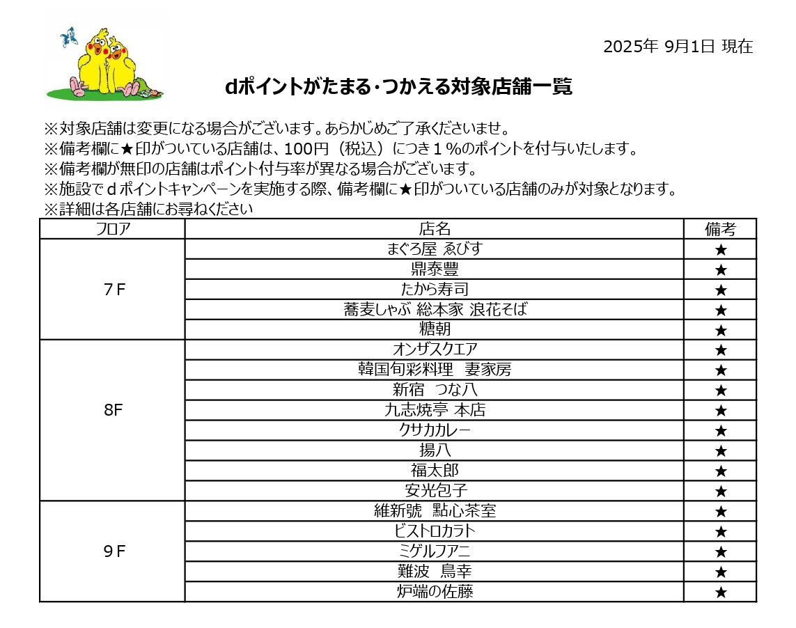 「dポイントがたまる・つかえる!」対象店舗について(9月1日更新) 投稿日:2025年09月01日(月) お客様各位 平素より格別のお引き立てを賜り、厚く御礼申し上げます。 なんばダイニングメゾンでは、dポイントの「たまる・つかう」をご利用いただけます(※一部店舗を除く)。 対象店舗は下記をご確認ください。 ※dポイントクラブ(なんばダイニングメゾン)のページはこちらから ※dポイントご利用ガイドはこちらから