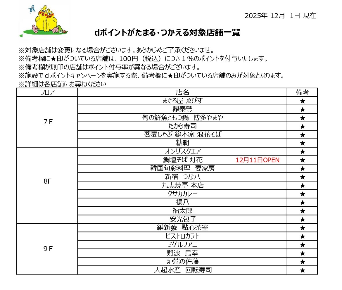 「dポイントがたまる・つかえる!」対象店舗について(12月1日更新) 投稿日:2025年12月01日(月) お客様各位 平素より格別のお引き立てを賜り、厚く御礼申し上げます。 なんばダイニングメゾンでは、dポイントの「たまる・つかう」をご利用いただけます(※一部店舗を除く)。 対象店舗は下記をご確認ください。 ※dポイントクラブ(なんばダイニングメゾン)のページはこちらから ※dポイントご利用ガイドはこちらから