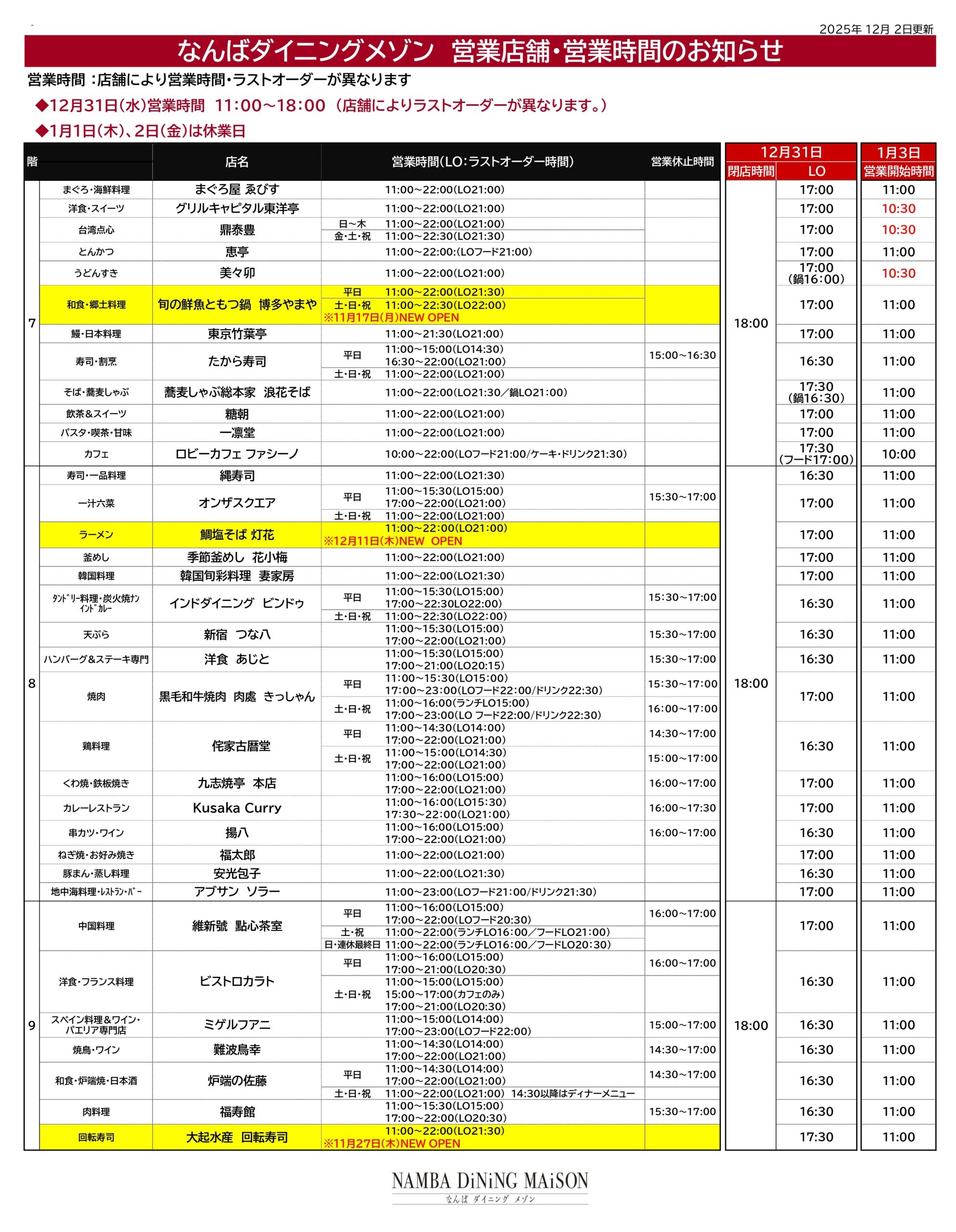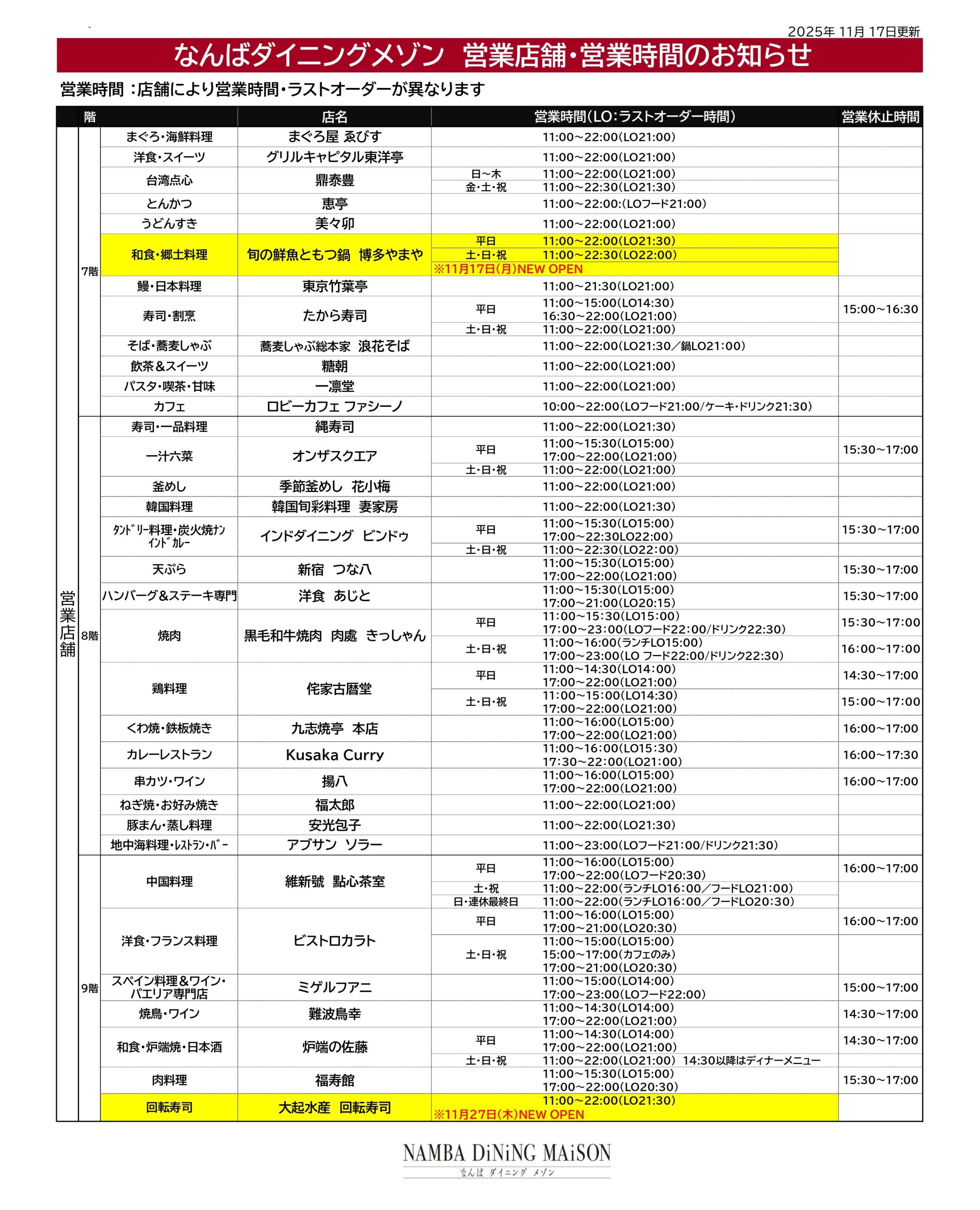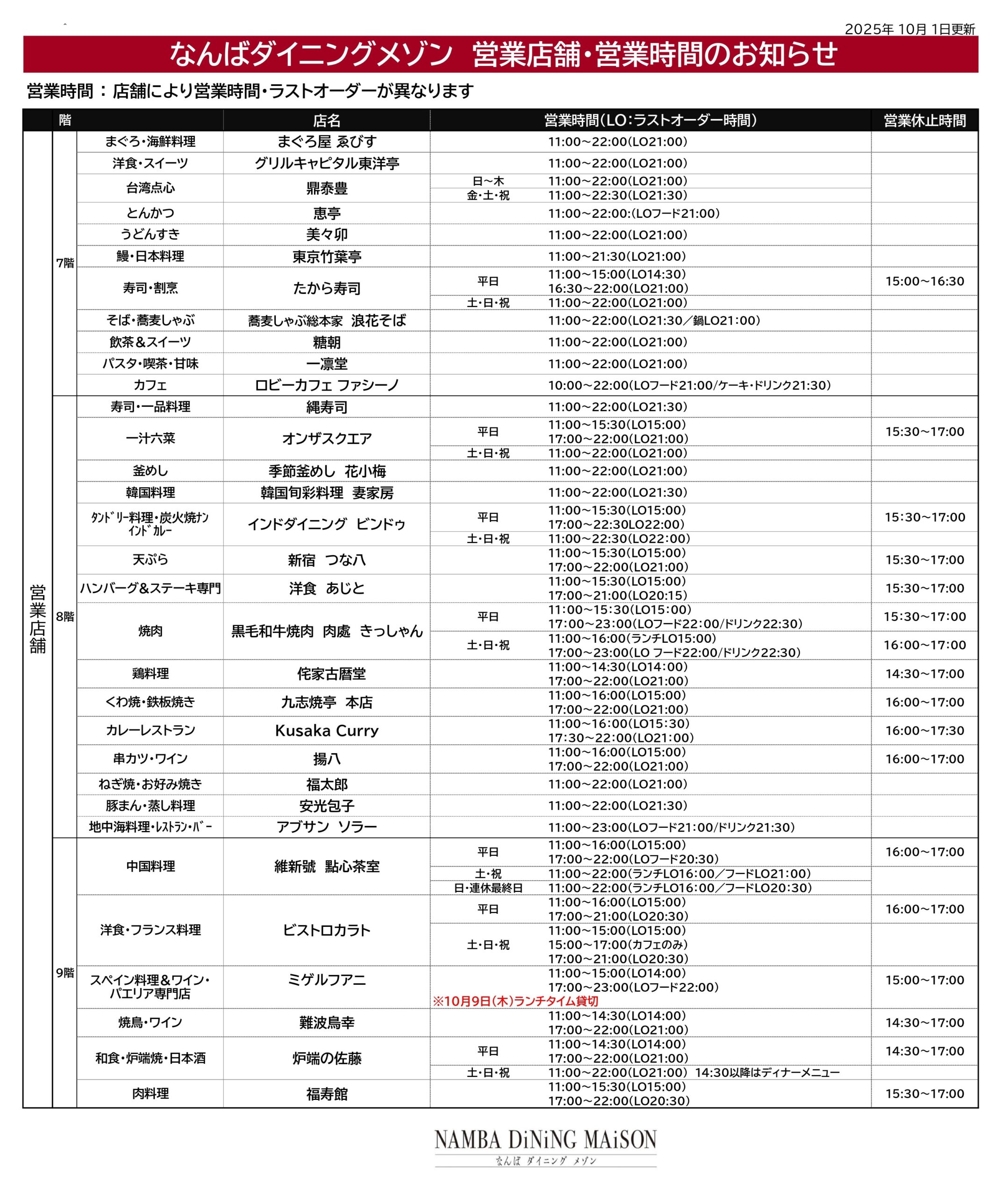 なんばダイニングメゾンの営業店舗ならびに営業時間は下記の通りでございます。