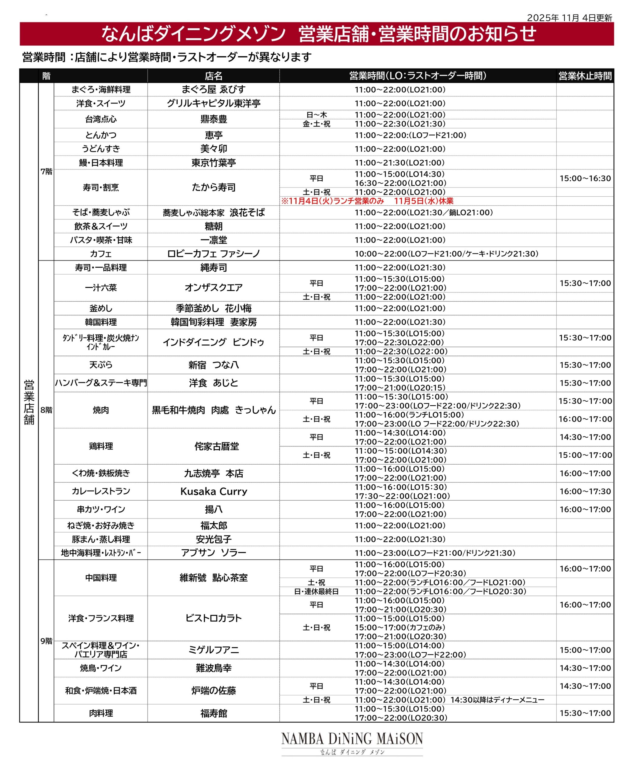 なんばダイニングメゾンの営業店舗ならびに営業時間は下記の通りでございます。